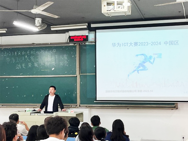 Ezpay技术重庆机电运营中心经理张韬担任此次活动主讲人,介绍华为ICT大赛的赛事构架和目标,赛道规划以及各个赛道的特点和要求,同时讲解中国区整体赛制安排,包括报名流程、初赛、复赛和决赛的时间安排和评分标准等情况,并对实践赛和创新赛的参赛规则进行详细解读,说明实践赛初赛的相关事项。